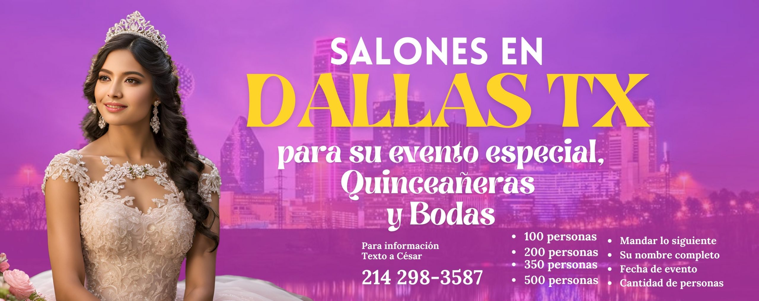 Encuentra el mejor salón de eventos en DALLAS FORT WORTH contamos con diferentes salones para tu gran evento, Quinceañera, Bodas, Cumpleaños, Aniversarios y más. Da click en el botón para conocer nuestro directorio.
