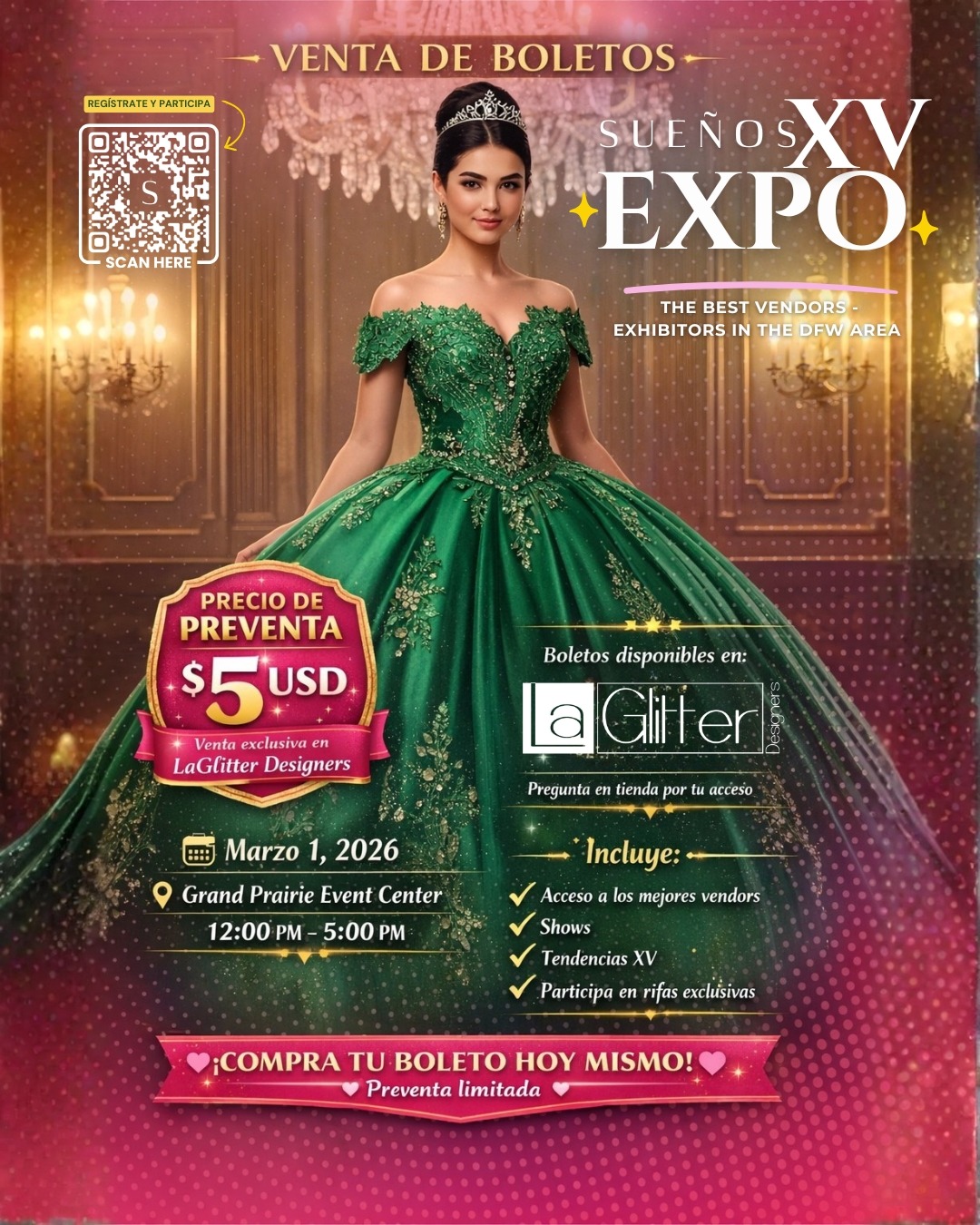 Sueños Quinceañera Expo, los mejores vendors de Dallas Fort Worth en un solo lugar, pide más información y únete a este gran evento.